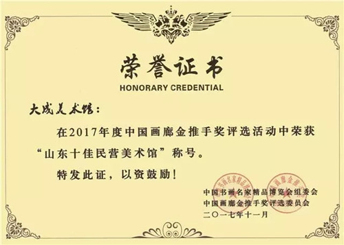 近日,在第六屆中國書畫市場健康發(fā)展論壇暨2017年度中國畫廊金推手獎頒獎盛典上,集團旗下的大成美術(shù)館(濟南城建集團直屬機構(gòu))應(yīng)邀參加論壇并榮獲2017年度“山東十佳民營美術(shù)館”稱號。