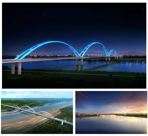 兩座大橋都采用了公軌合建、同層布置的橋梁形式,該形式可集約利用過河通道資源,降低工程規(guī)模,節(jié)省工程投資,拱肋從主梁橋面公路交通與軌道交通之間穿過,兼顧景觀效果及行車安全。