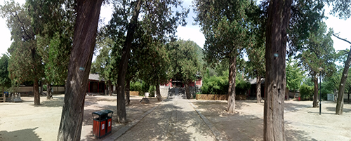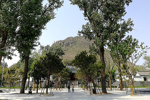 在綠地廣場面向一宮門,右側(cè)可以看到臥牛山的全貌,正面對(duì)視華山。兩側(cè)綠地每側(cè)精選了7棵造型油松,因?yàn)槿A陽宮道家文化的元素多些,此處也有北斗七星的意境。二是采用了借景、點(diǎn)景、框景的園林手法,借一宮門為背景,點(diǎn)造型松為景物,框出清晰的山體輪廓的畫面。
