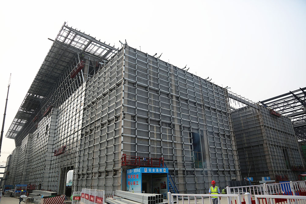 目前,展館區(qū)域主體鋼結(jié)構(gòu)進(jìn)入收尾階段,其中4號(hào)館、5號(hào)館已完成主體結(jié)構(gòu)驗(yàn)收,已全面轉(zhuǎn)入金屬屋面、幕墻外圍護(hù)體系及室內(nèi)裝飾、安裝施工階段;1號(hào)館、2號(hào)館及3號(hào)館主體鋼結(jié)構(gòu)施工正處于收尾階段;整個(gè)展館區(qū)域計(jì)劃6月底主體結(jié)構(gòu)封頂。
