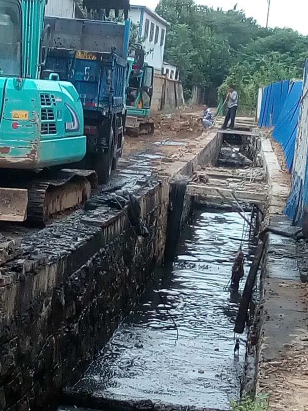 濟(jì)空四站邊溝是由拖機(jī)路自東向西的一條雨污混流的溝渠,主要污水來源為附近居民的生活污水,全長約1.56公里,斷面為1.6×1.8米,大部分是路面下的暗溝,約600米為明溝,明溝內(nèi)垃圾、淤泥沉積,黑臭水不斷,黑臭等級為重度黑臭水。