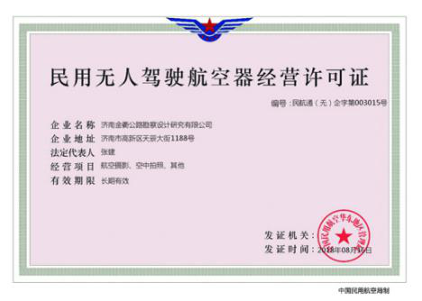 根據(jù)民航部門頒布的《民用無(wú)人駕駛航空器經(jīng)營(yíng)性飛行活動(dòng)管理辦法》及《無(wú)人機(jī)駕駛航空器飛行管理暫行條例》規(guī)定,濟(jì)南金衢公路勘察設(shè)計(jì)研究有限公司即刻選派人員參加無(wú)人機(jī)駕駛員培訓(xùn),于2018年8月16日獲得“中國(guó)民用航空華東地區(qū)管理局頒發(fā)的《民用無(wú)人駕駛航空器經(jīng)營(yíng)許可證》”,公司員工李波同志獲得民用無(wú)人機(jī)駕駛員合格證和無(wú)人機(jī)超視距駕駛員合格證。