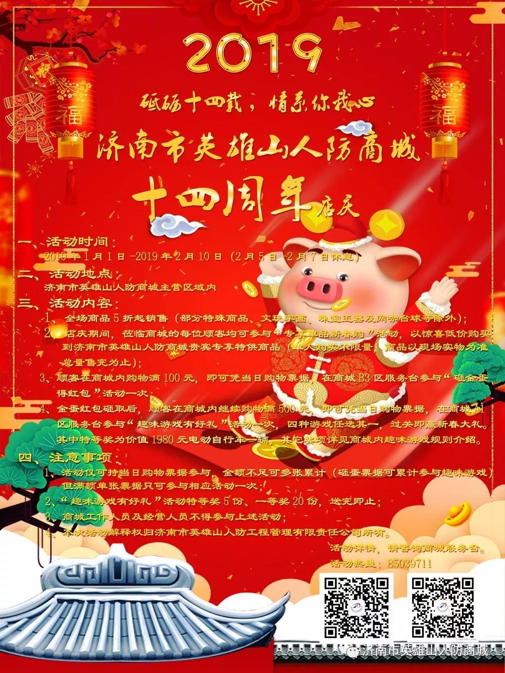 “十全十美,四海承平”。濟(jì)南市英雄山人防商城“相伴十四周年,共迎美好新年”主題十四周年店慶系列惠民活動(dòng)將于二〇一九年元月一日正式啟動(dòng)!