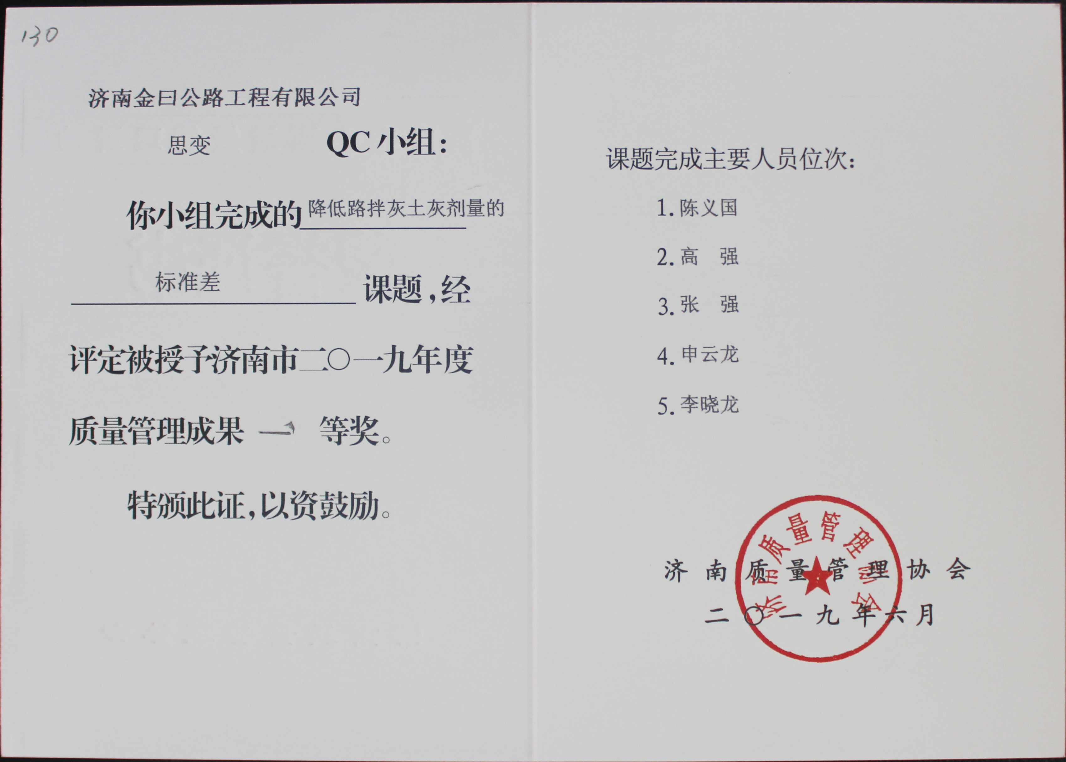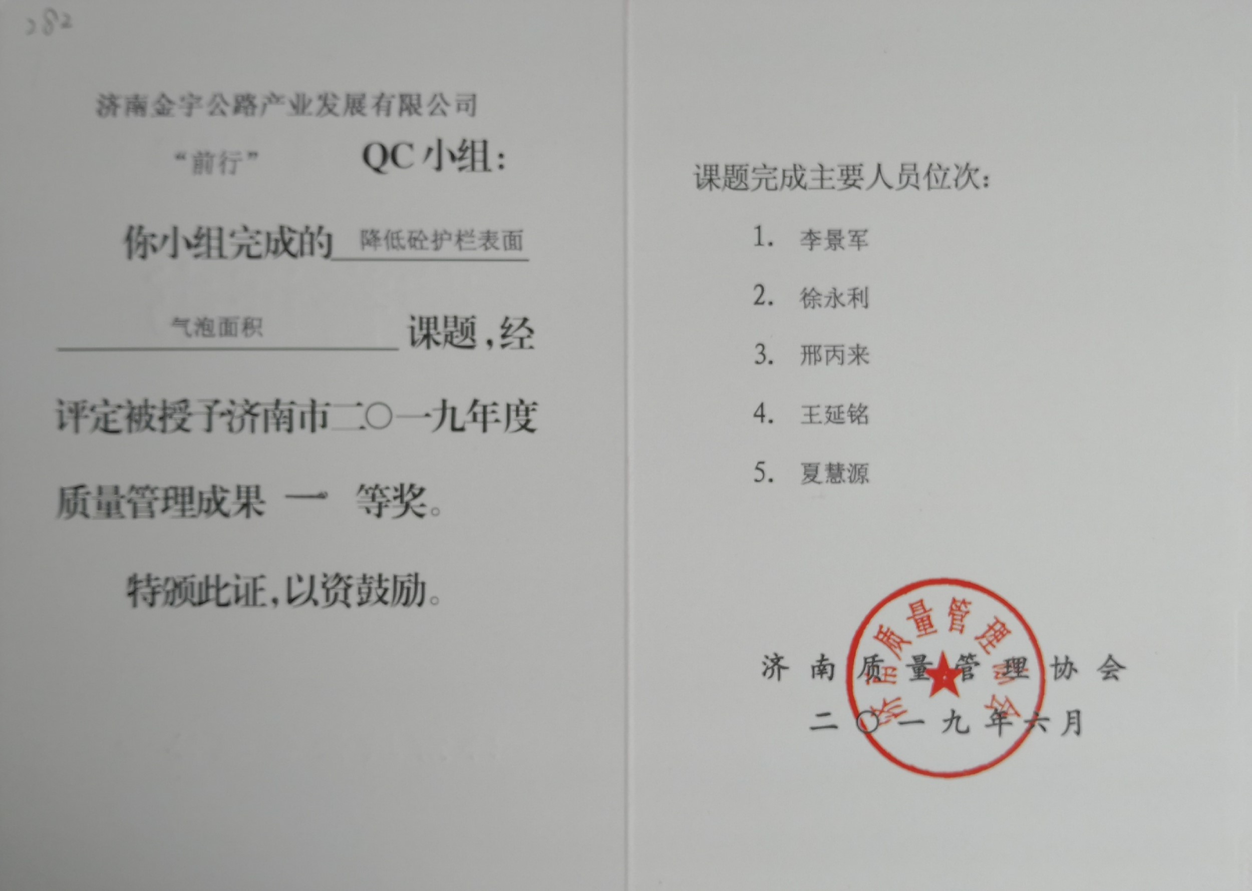 本次交流會發(fā)布QC成果124項(xiàng),金諾公司申報(bào)的四項(xiàng)QC成果獲得獎勵,其中《提高國省道工程附屬邊溝成品提交速度》、《提高預(yù)制箱梁質(zhì)量檢驗(yàn)評分》兩項(xiàng)課題榮獲“濟(jì)南市2019年質(zhì)量管理成果一等獎”;《提高瀝青混凝土路面行駛舒適性》一項(xiàng)課題榮獲“濟(jì)南市2019年質(zhì)量管理成果二等獎”;《提高擋土墻混凝土施工質(zhì)量》一項(xiàng)課題榮獲“濟(jì)南市2019年質(zhì)量管理成果三等獎”。