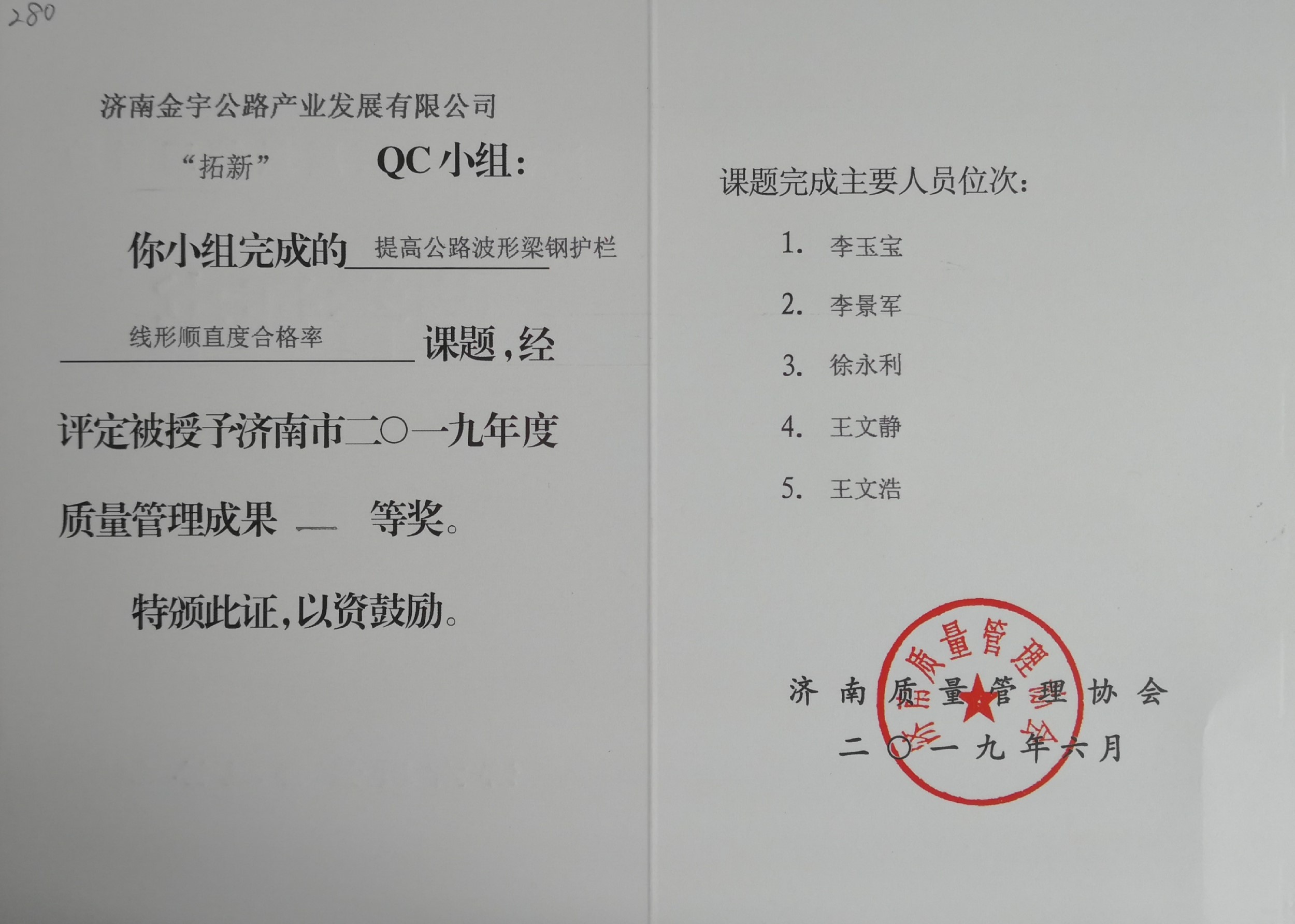 交流會上,現(xiàn)場專家根據(jù)其合理性、嚴(yán)密性及發(fā)布效果等方面對成果發(fā)布進(jìn)行綜合評審。經(jīng)過激烈角逐,金宇公司“拓新”QC小組、“前行”QC小組被授予濟(jì)南市二〇一九年度質(zhì)量管理成果一等獎,“起航”QC小組被授予濟(jì)南市二〇一九年度質(zhì)量管理成果二等獎,“創(chuàng)安”QC小組被授予濟(jì)南市二〇一九年度質(zhì)量管理成果三等獎;交安工程班組獲得“質(zhì)量信得過班組”榮譽(yù)稱號;李玉寶、李景軍、徐永利、賈雷霆獲得年度優(yōu)秀質(zhì)量管理工作者稱號。