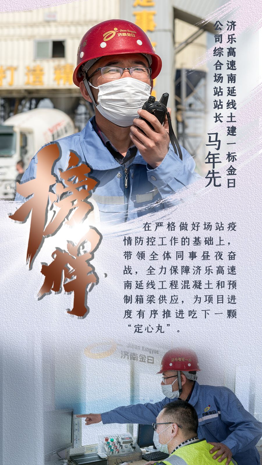 新型冠狀病毒肺炎疫情發(fā)生以來(lái),濟(jì)南城市建設(shè)集團(tuán)認(rèn)真貫徹落實(shí)中央、省、市關(guān)于疫情防控和復(fù)工復(fù)產(chǎn)的決策部署,上下一心、眾志成城,全體干部職工恪盡職守、扎根一線,全員全力投入到疫情防控阻擊戰(zhàn)中。期間,涌現(xiàn)出了眾多先進(jìn)典型和感人故事,用實(shí)際行動(dòng)詮釋了建設(shè)集團(tuán)人的精神風(fēng)貌和責(zé)任擔(dān)當(dāng)。我們?cè)诩瘓F(tuán)宣傳平臺(tái)《榜樣》欄目,推出系列人物報(bào)道,挖掘宣傳一線典型,提振士氣、凝聚力量,激勵(lì)我們繼續(xù)前行,堅(jiān)決打贏疫情防控的人民戰(zhàn)爭(zhēng)、總體戰(zhàn)、阻擊戰(zhàn)。