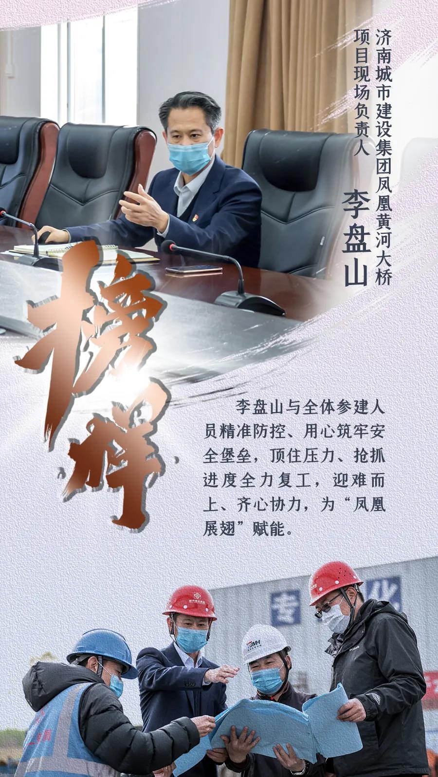 陽春三月,兩岸新綠。鳳凰黃河大橋施工現(xiàn)場(chǎng),各施工區(qū)域熱火朝天、作業(yè)正忙。自項(xiàng)目全面復(fù)工以來,1000多名工人日夜奮戰(zhàn)一線,在做好疫情防控工作基礎(chǔ)上,項(xiàng)目建設(shè)各項(xiàng)工作全速推進(jìn)。作為濟(jì)南城市建設(shè)集團(tuán)鳳凰黃河大橋項(xiàng)目現(xiàn)場(chǎng)負(fù)責(zé)人,李盤山與全體參建人員精準(zhǔn)防控、用心筑牢安全堡壘,頂住壓力、搶抓進(jìn)度全力復(fù)工,迎難而上、齊心協(xié)力,為“鳳凰展翅”賦能。