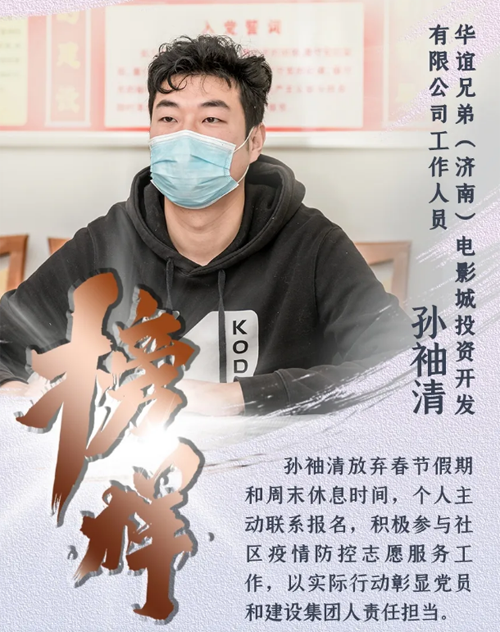 近日,一封來自槐蔭區(qū)段店社區(qū)居民委員會的感謝信發(fā)至濟(jì)南城市建設(shè)集團(tuán),感謝信的“主角”是集團(tuán)所屬華誼兄弟(濟(jì)南)電影城投資開發(fā)有限公司的孫袖清同志。新型冠狀病毒肺炎疫情發(fā)生以來,孫袖清放棄春節(jié)假期和周末休息時間,個人主動聯(lián)系報(bào)名,積極參與社區(qū)疫情防控志愿服務(wù)工作,以實(shí)際行動彰顯黨員和建設(shè)集團(tuán)人責(zé)任擔(dān)當(dāng),用無私奉獻(xiàn)展現(xiàn)一名“80后”的青春力量,與社區(qū)工作人員共同筑牢社區(qū)疫情防控安全線。