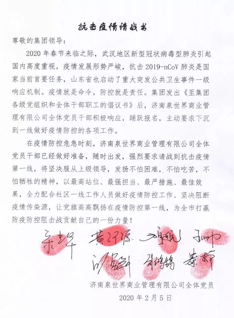在接到集團通知后,泉世界商管公司高度重視,立刻組織公司黨員開會學(xué)習(xí)集團指示,部署工作任務(wù)。印象濟南·泉世界執(zhí)行董事兼總經(jīng)理宋光華率先垂范帶頭報名,公司全體黨員干部第一時間積極響應(yīng),踴躍報名,主動要求下沉到一線做好疫情防控的各項工作,以實際行動守初心、擔使命,為打贏疫情防控阻擊戰(zhàn)作出新的更大貢獻!最終,公司7名黨員干部全部報名請求到抗擊疫情一線工作,并在《抗擊疫情請戰(zhàn)書》上簽字按手印。