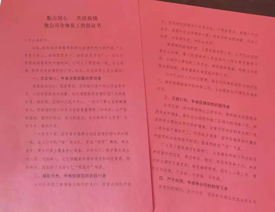 公司黨支部、團支部向公司全體職工發(fā)出倡議,爭做決策部署的貫徹者、疫情防控的踐行者、疫情信息的宣傳者、時間管理的學(xué)習(xí)者,勠力同心,共抗疫情!