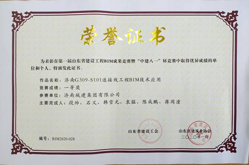 近日,山東省建筑業(yè)協(xié)會(huì)舉辦第一屆山東省建設(shè)工程BIM成果競(jìng)賽暨“中建八一”杯BIM競(jìng)賽公開(kāi)答辯和競(jìng)賽成果交流會(huì),濟(jì)南城建集團(tuán)有限公司攜1項(xiàng)作品“濟(jì)南G309-S101連接線工程BIM技術(shù)應(yīng)用”參加。經(jīng)過(guò)技術(shù)人員匯報(bào)、答辯與專家評(píng)選,城建集團(tuán)參賽作品最終榮獲一等獎(jiǎng)。