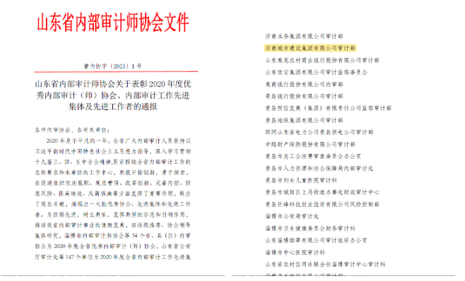 今年以來,通過加快建章立制,明確規(guī)定了審計(jì)年度計(jì)劃制定、方案制定、證據(jù)收集、底稿日志編寫、報(bào)告質(zhì)量控制、檔案管理等全流程標(biāo)準(zhǔn),逐步形成了一整套行之有效的內(nèi)部審計(jì)制度體系,并榮獲“山東省內(nèi)部審計(jì)工作先進(jìn)單位”稱號(hào)。
