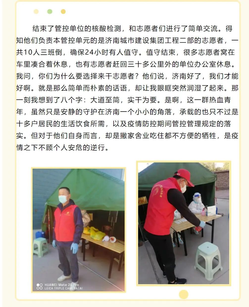 “他們說,濟(jì)南好了,我們才能好啊。簡單而樸素的話語,卻讓我眼眶突然潤濕了起來,那一刻我想到了八個(gè)字:大道至簡,實(shí)干為要。”近日,歷城區(qū)董家街道辦的工作人員在“愛董家”微信平臺(tái)上寫下了這樣的話,他口中的“他們”便是按照集團(tuán)統(tǒng)一部署下沉到董家街道社區(qū)的工程二部志愿者們。