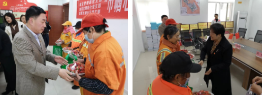 活動中,雙方黨支部黨員對“三八”國際婦女節(jié)仍堅(jiān)守一線工作崗位的環(huán)衛(wèi)女職工表示崇高的敬意,并對他們無私奉獻(xiàn)、任勞任怨的品質(zhì)表示贊許,同時(shí)向環(huán)衛(wèi)職工送上慰問品。