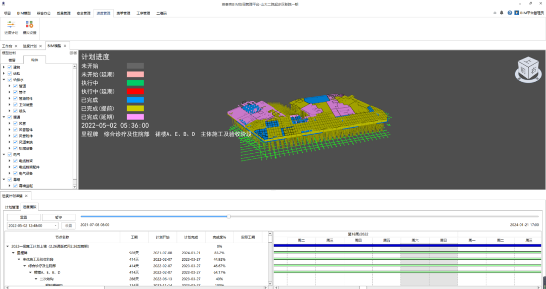 結合項目結構超限設計的實際,為從根本上解決因后澆帶設置過多而產(chǎn)生的進度、質量、安全文明問題,論證實施了“跳倉法”施工工藝,按“塊料規(guī)劃、塊料施工、分層澆注、整體成型”的原則施工,加大資源調(diào)配力度,在節(jié)約工期的同時,實現(xiàn)文明施工、質量控制、進度管理有益結合。深入推進BIM全過程管理應用,實現(xiàn)以BIM模型為基礎的三維圖紙審查、碰撞檢測、凈高分析、設計方案比選、施工模型深化、管線綜合、進度模擬、數(shù)據(jù)共享等功能,為施工方案編制論證、進度檢查反饋、圖紙審查評價等多方面提供了多維度的強大支持。