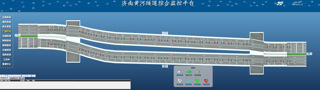 在濟南黃河濟濼路隧道中,交通系統(tǒng)的主要設備包括72個道路指示燈、7塊情報板和12組車感線圈,設備的應用可以有效地誘導車輛按照規(guī)定的路線和速度行駛,保證交通流暢和安全,進一步提高交通運營效率;