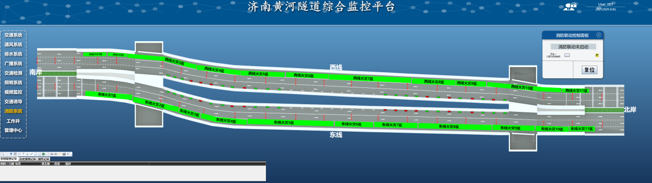 隧道消防系統(tǒng)擁有147套泡沫噴霧、136個雙波長火焰探測器、87個消火栓箱、288個滅火器箱、2條感溫光纖和6臺功率110kw風量36萬m³/h排煙風機,設備的應用可以在火災初期及時發(fā)現(xiàn)并處理火災,保障隧道內(nèi)人員和設施的安全;