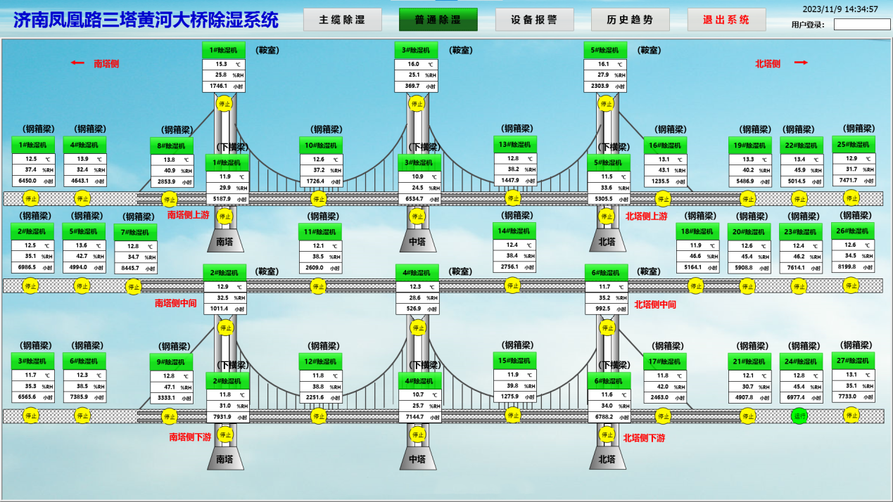 為保持橋梁結(jié)構強度,防止鋼箱梁、內(nèi)部鋼架、主纜銹蝕,延長橋梁使用壽命,大橋安裝有3套主纜除濕系統(tǒng)、6套鞍室除濕系統(tǒng)、6套主塔除濕系統(tǒng)、27套鋼箱梁除濕機。所有除濕機都使用網(wǎng)格連接,通過邏輯控制系統(tǒng)實現(xiàn)數(shù)據(jù)共享、自動化除濕等任務,時刻消除設備頑疾病害,提高行車安全系數(shù)。