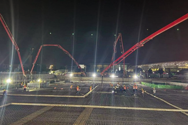 本次澆筑從9月6日22時(shí)開(kāi)始,歷時(shí)30小時(shí),4臺(tái)泵車(chē)聯(lián)合作戰(zhàn),順利澆筑完成3800立方米混凝土。為完成施工區(qū)域道路導(dǎo)改及管線遷改,臨八路人防頂板先行施工,人防蓋板由鋼管柱支撐,長(zhǎng)度49米,寬度73.5米,蓋板下主體結(jié)構(gòu)及土方施工采用蓋挖法施工,結(jié)構(gòu)主體采用C45P8抗?jié)B混凝土。