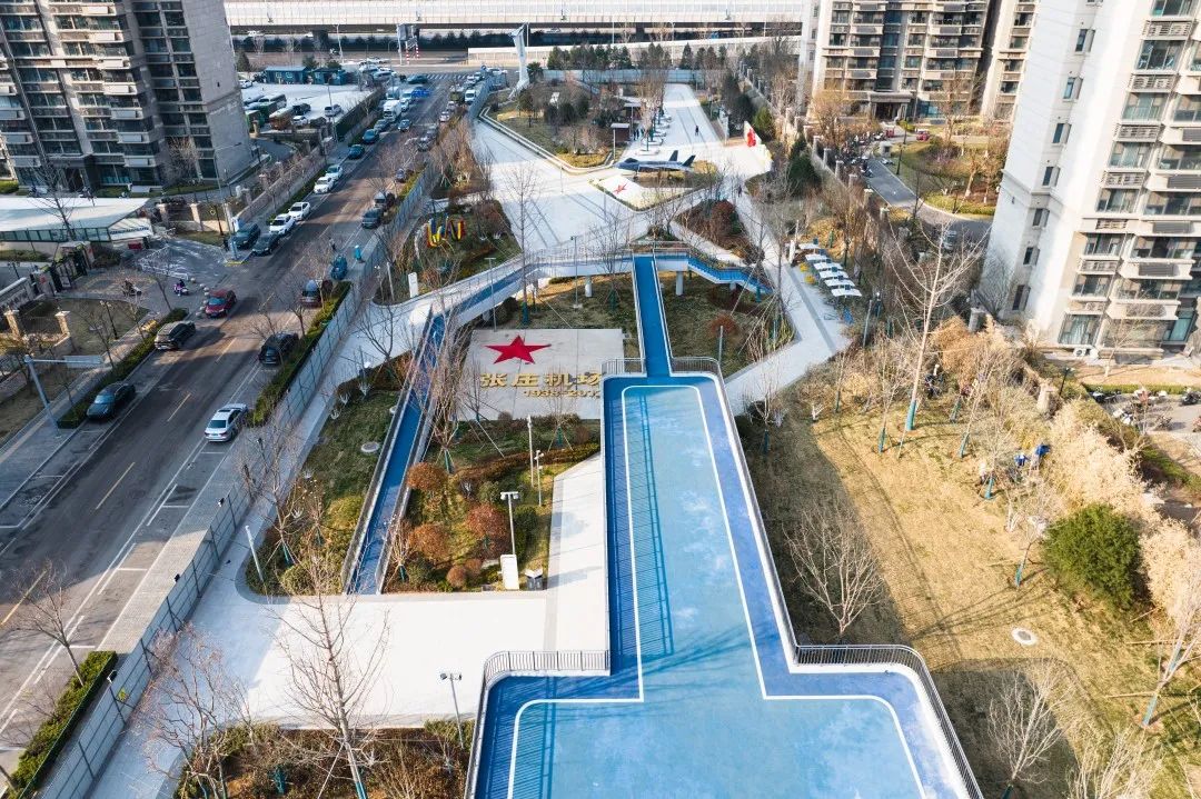 公園南區(qū)入口打造文化長廊,通過展示中國戰(zhàn)機發(fā)展史讓市民了解空軍文化;結(jié)合原有170米長水泥跑道,通過景觀手法進行二次設(shè)計,融合機場跑道符號、導航等設(shè)施還原機場跑道場景,沿跑道科普展示曾在張莊機場服役的戰(zhàn)機模型,進行航空科普、國防軍事及愛國主義教育。