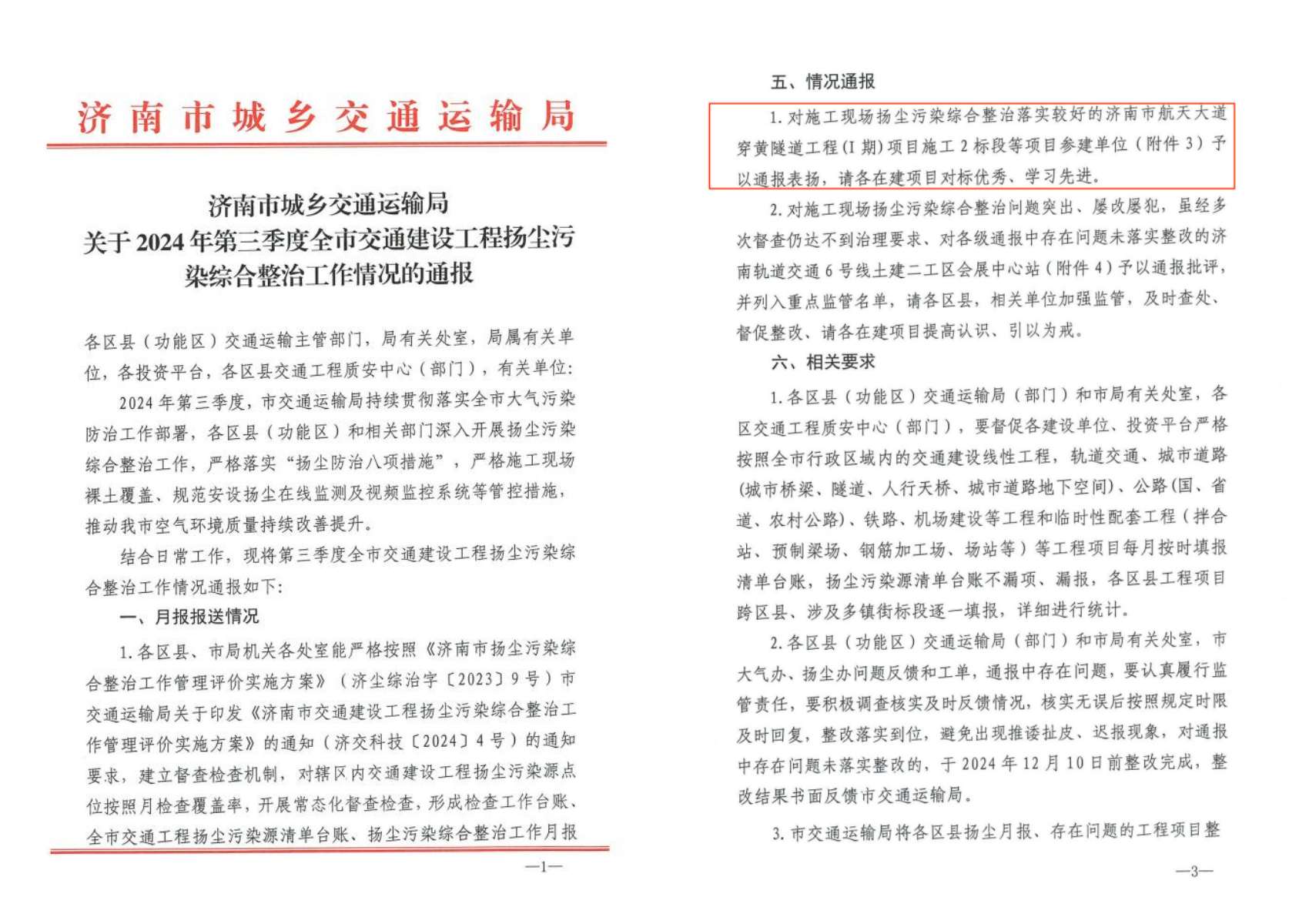 近日,濟(jì)南市城鄉(xiāng)交通運(yùn)輸局公布了2024年第三季度交通建設(shè)工程揚(yáng)塵治理通報,建設(shè)集團(tuán)投資建設(shè)的濟(jì)南市航天大道穿黃隧道工程(I期)項目施工2標(biāo)段脫穎而出,被予以通報表揚(yáng),該標(biāo)段由中交隧道工程局有限公司承建。