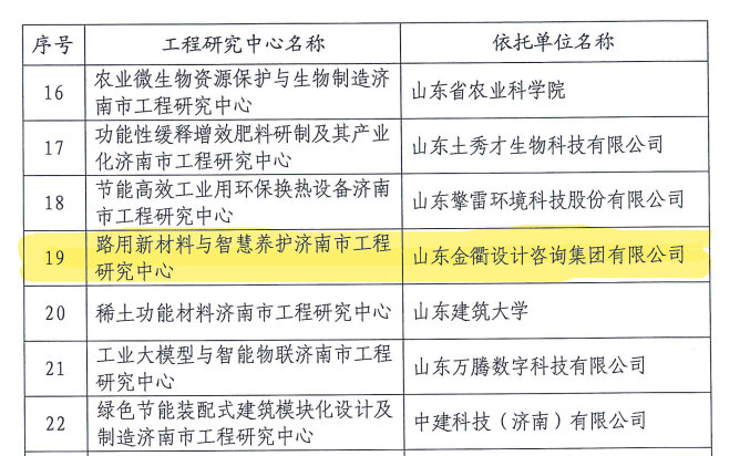 近日,濟南市發(fā)展和改革委員會下發(fā)《關(guān)于公布2024年度認定濟南市工程研究中心名單的通知》,建設(shè)集團所屬山東金衢設(shè)計集團有限公司“路用新材料與智慧養(yǎng)護濟南市工程研究中心”(以下簡稱工程研究中心)經(jīng)嚴格考察、評審和公示,成功入選,這是2024年金衢集團公司繼濟南市重點實驗室、專家工作站、服務(wù)業(yè)創(chuàng)新中心后獲批的又一科創(chuàng)平臺。
