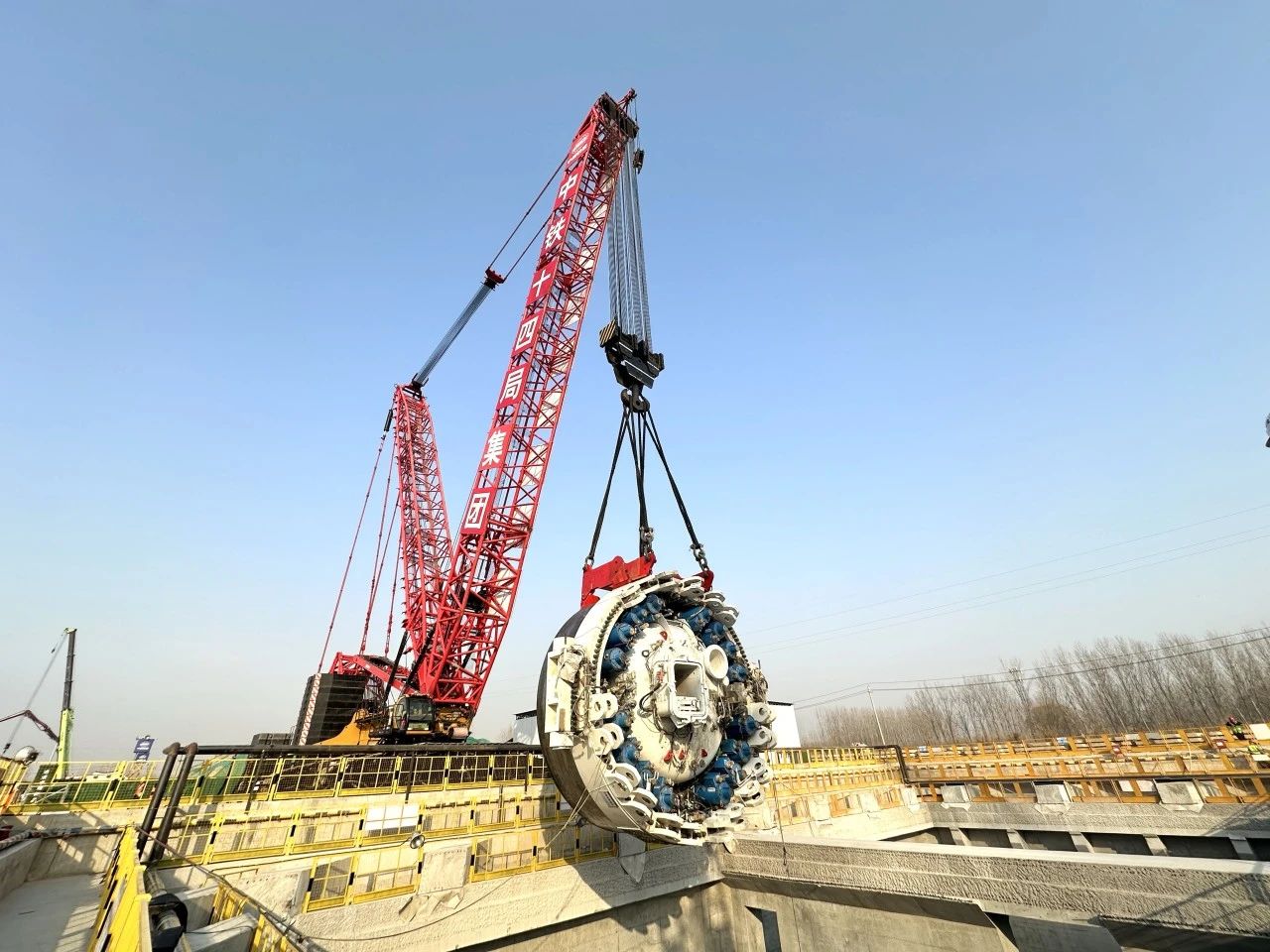 用于濟(jì)南市航天大道穿黃隧道施工的“啟航號(hào)”盾構(gòu)機(jī)長達(dá)161米,總重量約4295噸,盾構(gòu)機(jī)直徑15.06米。此次吊裝下井的主驅(qū)動(dòng)寬7.6米、重390噸,是整個(gè)盾構(gòu)機(jī)的核心部件,也是整個(gè)盾構(gòu)機(jī)吊裝組裝階段最為關(guān)鍵的一環(huán)。