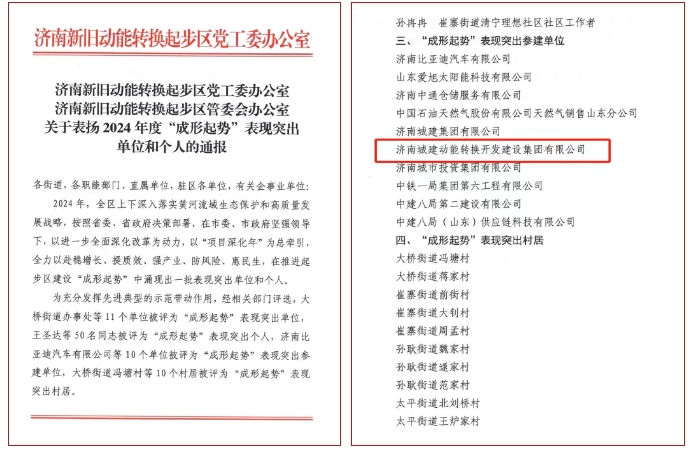2月6日,濟(jì)南新舊動(dòng)能轉(zhuǎn)換起步區(qū)召開2025年工作動(dòng)員大會(huì),通報(bào)表彰2024年度“成形起勢”表現(xiàn)突出的單位及個(gè)人。建設(shè)集團(tuán)所屬濟(jì)南城建動(dòng)能轉(zhuǎn)換開發(fā)建設(shè)集團(tuán)有限公司,榮獲2024年度起步區(qū)“成形起勢”表現(xiàn)突出參建單位。