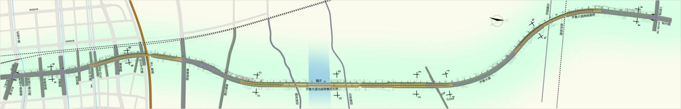 一標(biāo)段南起現(xiàn)狀濟(jì)齊路,向北與虹吸干渠南路、虹吸干渠北路、吳家堡路、治黃路、規(guī)劃路相交,采用高架形式跨越太平河南支路、太平河北支路、美里路、太平河北路、濟(jì)廣高速后,在美里湖路前落地,高架橋兩側(cè)設(shè)置一對(duì)輔道實(shí)現(xiàn)各交通流向的轉(zhuǎn)換,終點(diǎn)接黃河大橋引橋,平面線(xiàn)位與規(guī)劃線(xiàn)位一致,道路全長(zhǎng)3671.89米。